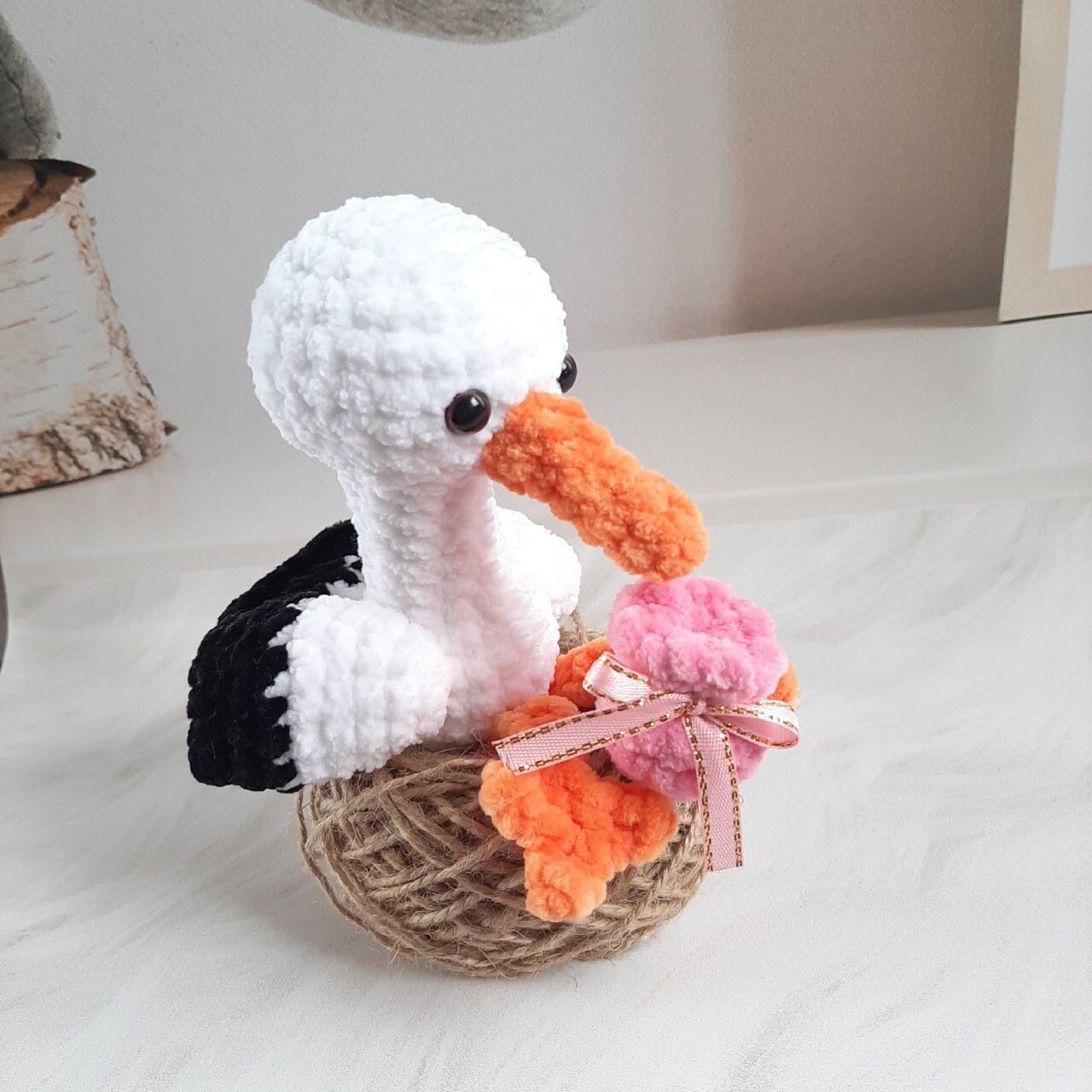 little stork toy is made of plush yarn.
